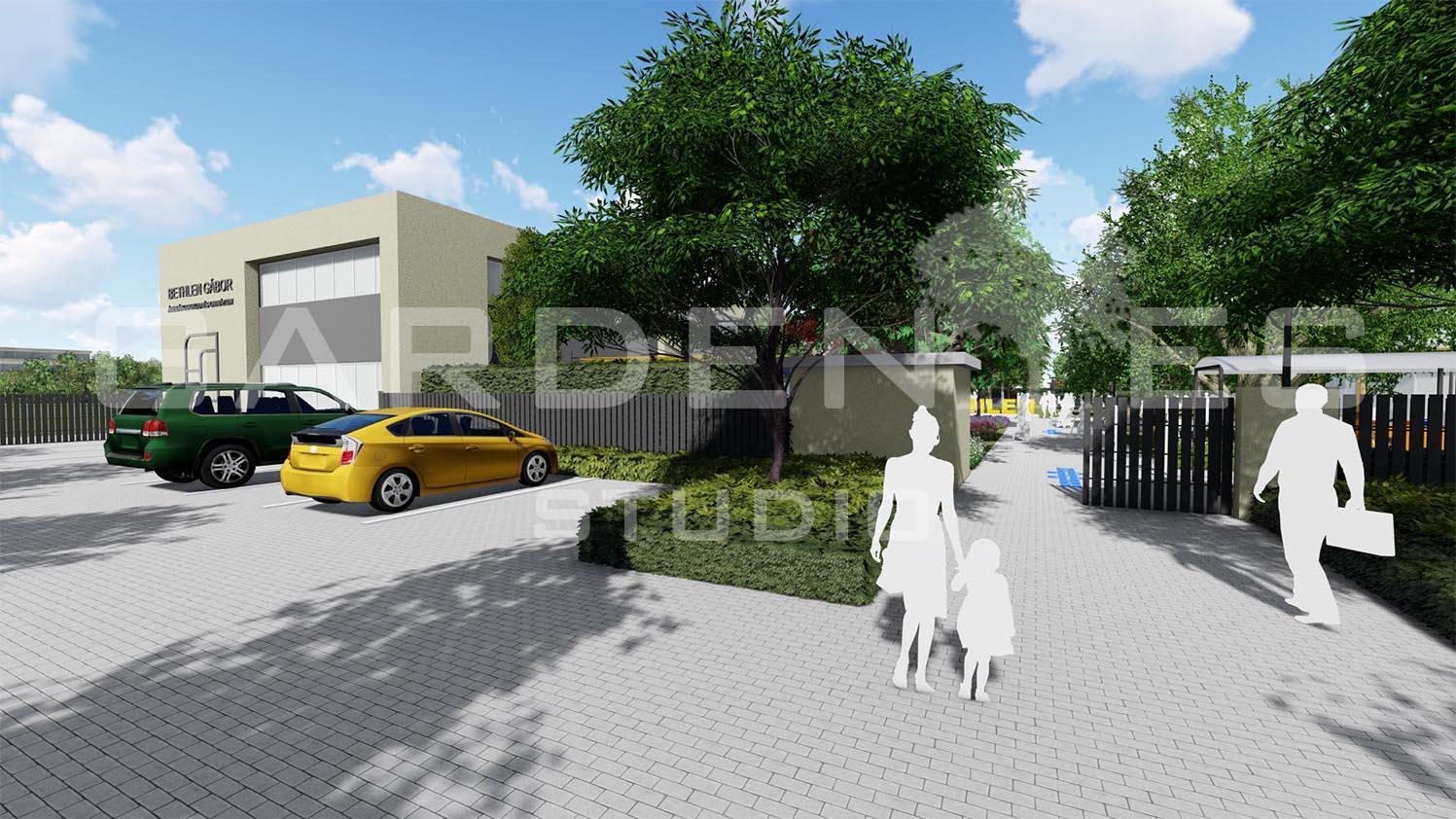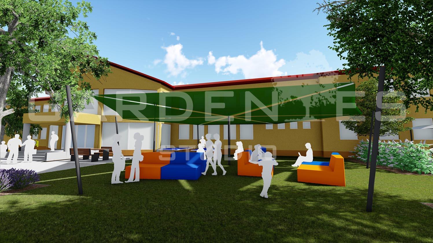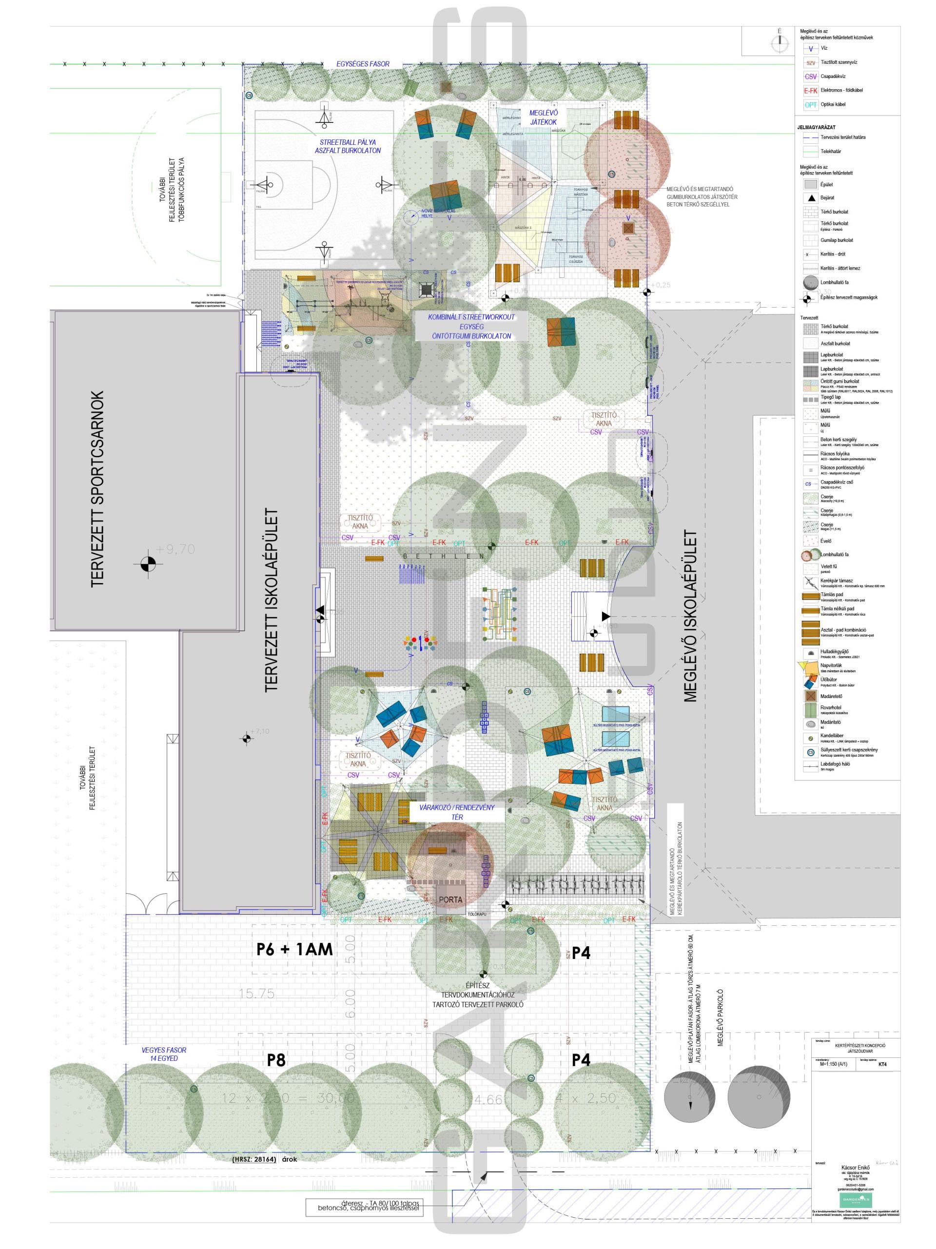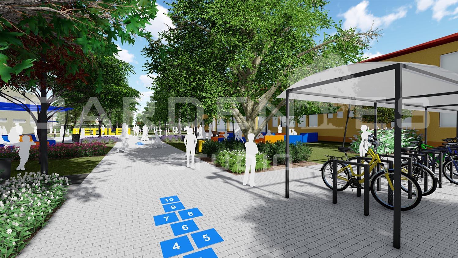 A tervezési feladatom az intézményhez tartozó régi és új iskolaegység közötti udvarrész és az újonnan kialakított parkoló zöldfelületi terveinek elkészítése. A játszóudvaron 3 nagyobb különböző funkciójú területet alakítottam ki. A terület főbejárathoz közelebb eső, déli részén került kialakításra egy kisebb várakozó / közösségi tér. A lapburkolatos területen napvitorlás árnyékolók alatt pad-asztal kombinációk kerültek elhelyezésre. A terület közvetlen kapcsolatba van az új épület déli földszintjén kialakított ebédlővel, így alkalmassá válik kisebb rendezvények megtartására, vagy jó időben az ebédek elfogyasztására. A várakozó tér északi és keleti oldalán egy-egy közösségi pihenő-, beszélgetős területet alakítottam ki. Mindkét helyen napvitorlás árnyékolók alatt vagány, fiatalos, színes, nagyméretű ülőbútorokat és kültéri, mozgatható ping-pong asztalokat helyeztem el. A meglévő épület és az új épület bejárati tengelyében széles, szabad burkolt részt terveztem, mely alkalmas iskolai rendezvények, családi napok megtartására. A nagy egybefüggő burkolatot aszfaltfestésekkel színesítettem.