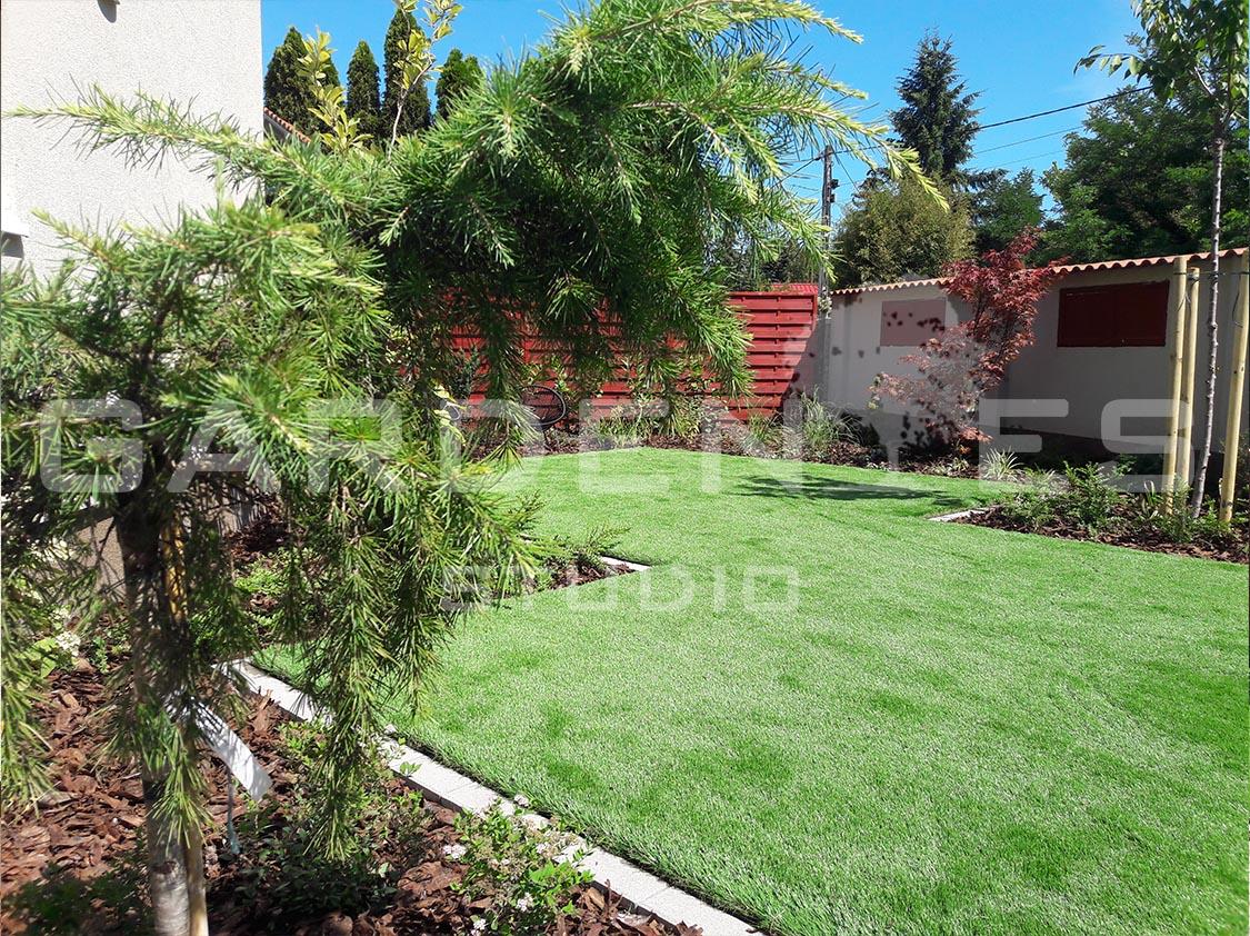 Ikerházas beépítés utcafronti épületéhez tartozó kert megtervezése és kivitelezése volt a feladatom. A Megrendelői igények között szerepelt, hogy egy könnyen fenntartható, pihenésre alkalmas kertrészt hozzak létre. A terület napos oldalán helyet kapott egy kis helyigényű szék-asztal kombináció, ahonnan a kerttulajdonos élvezheti a kert látványát. A kerítés mentén U alakban vegyes, sok virágzó évelőt tartalmazó ágyást hoztam létre. Az üres falfelületeket tekintet vonzó nagytermetű cserjékkel és oszlopos örökzöldekkel törtem meg. A növények közelébe telepített leszúrható, dekor világítótestek gondoskodnak a kert esti hangulatáról. A terület közepén elhelyezett szabad gyepes részen Megrendelői kérésre a heti fűnyírási „gondokat’ műfű telepítéssel oldottam meg.