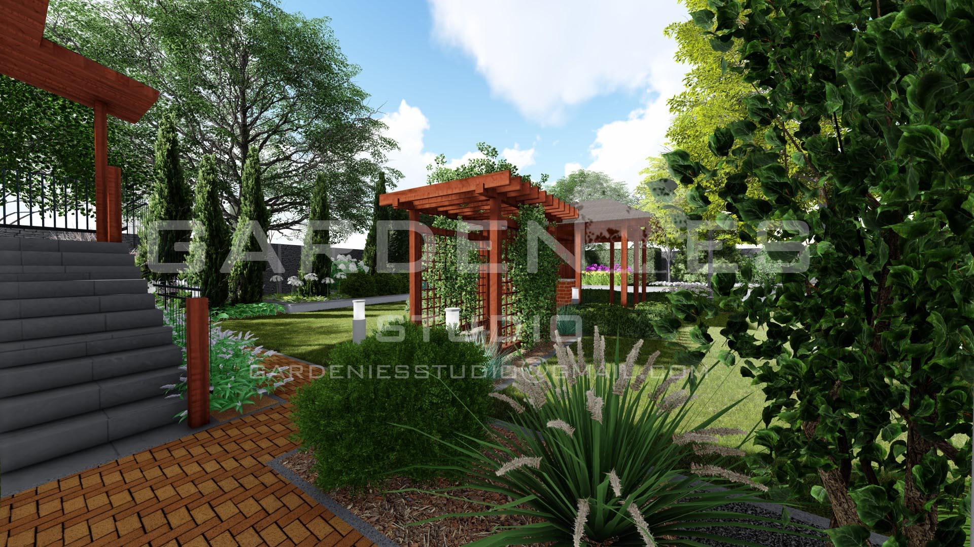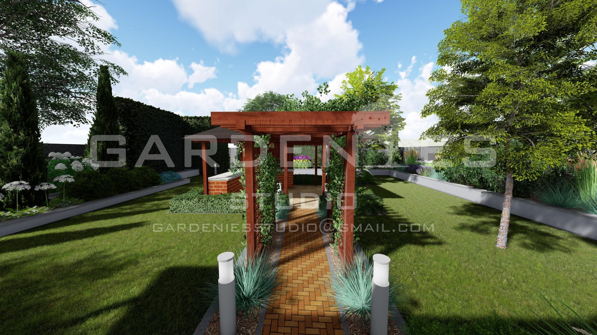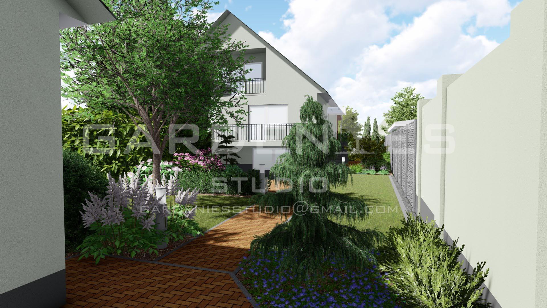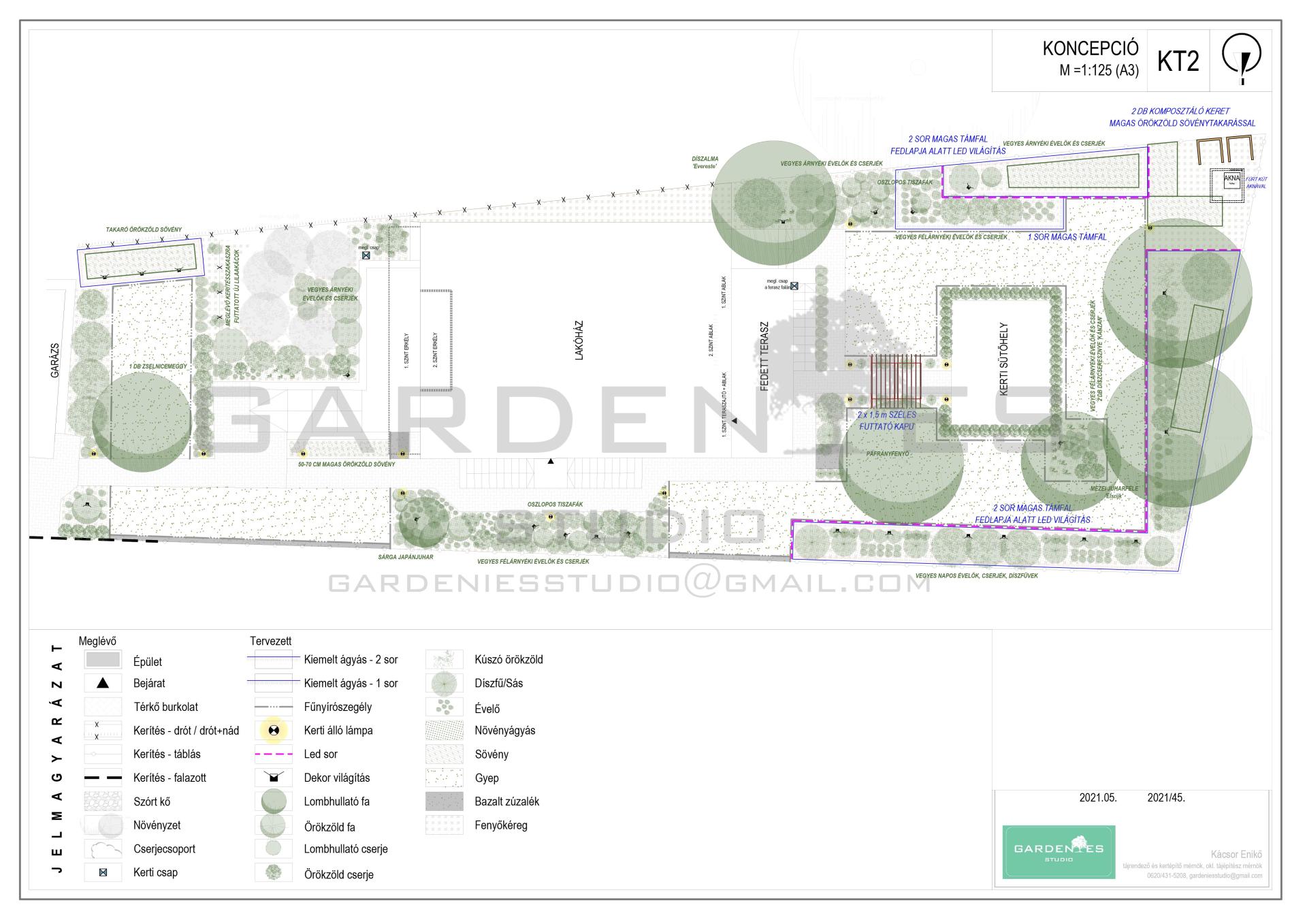 Ebben a munkában egy meglévő ház, meglévő kertjének átalakításával bíztak meg. A kertben a burkolatokat, a kerítést és a hátsókertben elhelyezett fedett kerti sütőhelyet megtartották, így ezeket adottságnak tekintettem. A garázs és a lakóház között elhelyezkedő előkertben jól megkomponált vegyes növényágyásokat alakítottam ki a kisebb gyepfelületek mellett. A lakóépület főbejárata előtt oszlopos tiszafákból és vegyes félárnyéki takartakaró évelőkből álló kompozíciót terveztem. A hátsókertben lévő kerti sütőhely körül meghagytam a szabad gyepfelületeket és a kerítés előtt hoztam létre különböző magasságú és szélességű kiemelt ágyásokat. A szomszédos telkek felőli belátást és rálátást a kerítést túlnövő, örökzöld sövénysávokkal és lombtartó cserjesorokkal takartam.
